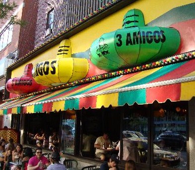 The 3 Amigos is a fun Mexican restaurants with a few different locations. The two I go to are the addresses I captioned under the picture (and that one in the picture is the Montreal location). I doubt it’s authentic Mexican food, but it’s still very good. They have specials during the week for taco platters and fajita plates (which is what I usually end up ordering. They have everything you’d expect a standard Mexican place to have, tacos, fajitas, burritos, nachos, enchiladas and the like, and they have a few things you might not expect, like lamb steaks or pasta platters. ImageTheir frozen drinks (margaritas, pina coladas and daiquiris) are amazing and huge. The large is made with two ounces of rum and is served in what I like to call a fish bowl. Seriously, the thing is fucking huge. I always get the strawberry daiquiri. I’m sure everything else is good too (I’ve been tempted by the mango a few times) but ultimately I always opt for the strawberry daiquiri. I’m a creature of habit, what can I say. As soon as we’re seated in the restaurant, even before getting water, we’re offered a basket of tortilla chips and fresh salsa. We have to be careful, since these are all-you-can-eat, that we don’t stuff our faces full of these before even ordering. But they’re really, really good. That salsa wouldn’t last long in my house. I went recently with my sister, and that little basket was empty before we even received our drinks. We were good, and didn’t order more to leave room for our meals (I broke my routine this one time, and ordered soft shelled tacos instead of my usual beef-chicken fajitas). I’m not sure where all that willpower came from! hehe
