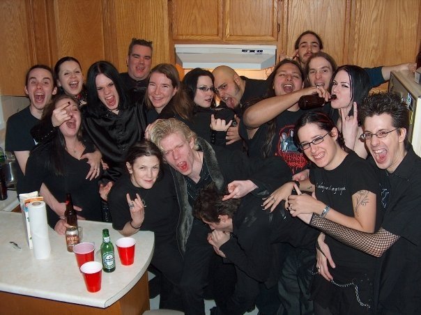 This is what a real goth party looks like. That’s me in the front with the glasses (hi!) and the cutie in the fishnet behind me (yelling like a banshee, hehe) is my dear husband. And while I’ll admit we’re not the most colourful bunch, it’s a far cry from what’s in the top pictures. “But ok, Mel,” you say, “but what about at a nightclub. like the first guy? Surely that’s how it is?”